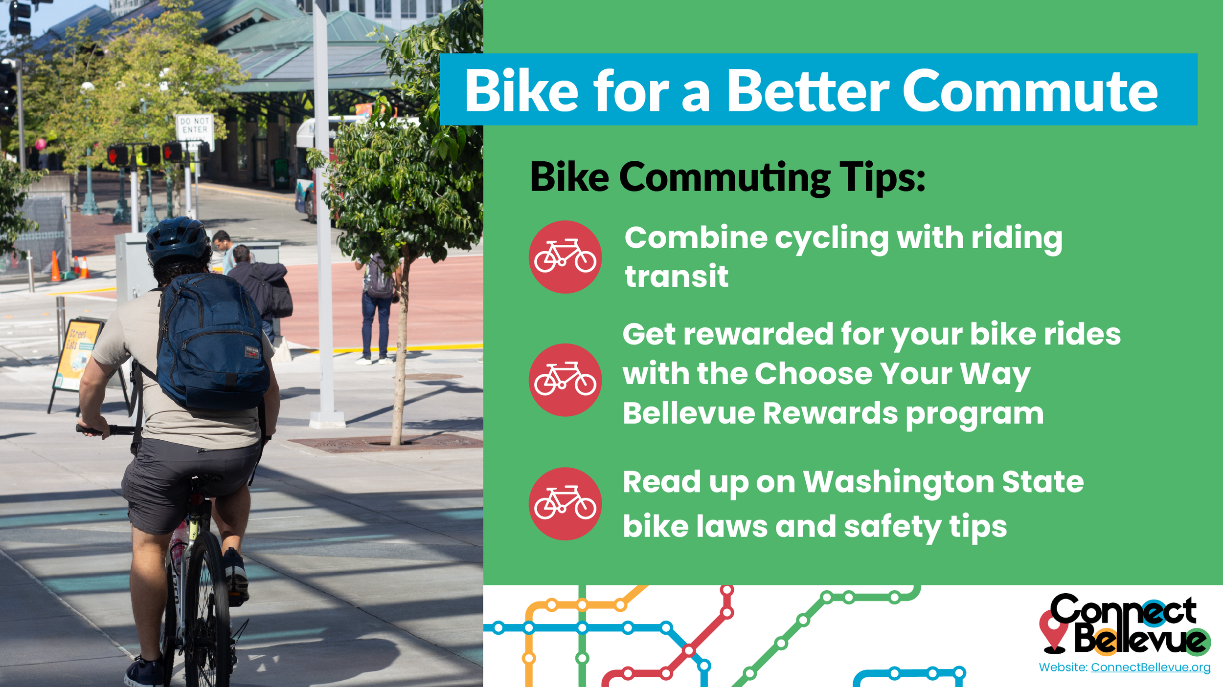 City of Bellevue Bike Etiquette [PDF] - This handout outlines Bellevue’s biking rules of the road, including helmet requirements, sidewalk and crosswalk rights, e-bike restrictions, yielding to pedestrians, obeying traffic laws, and required lights for night riding.